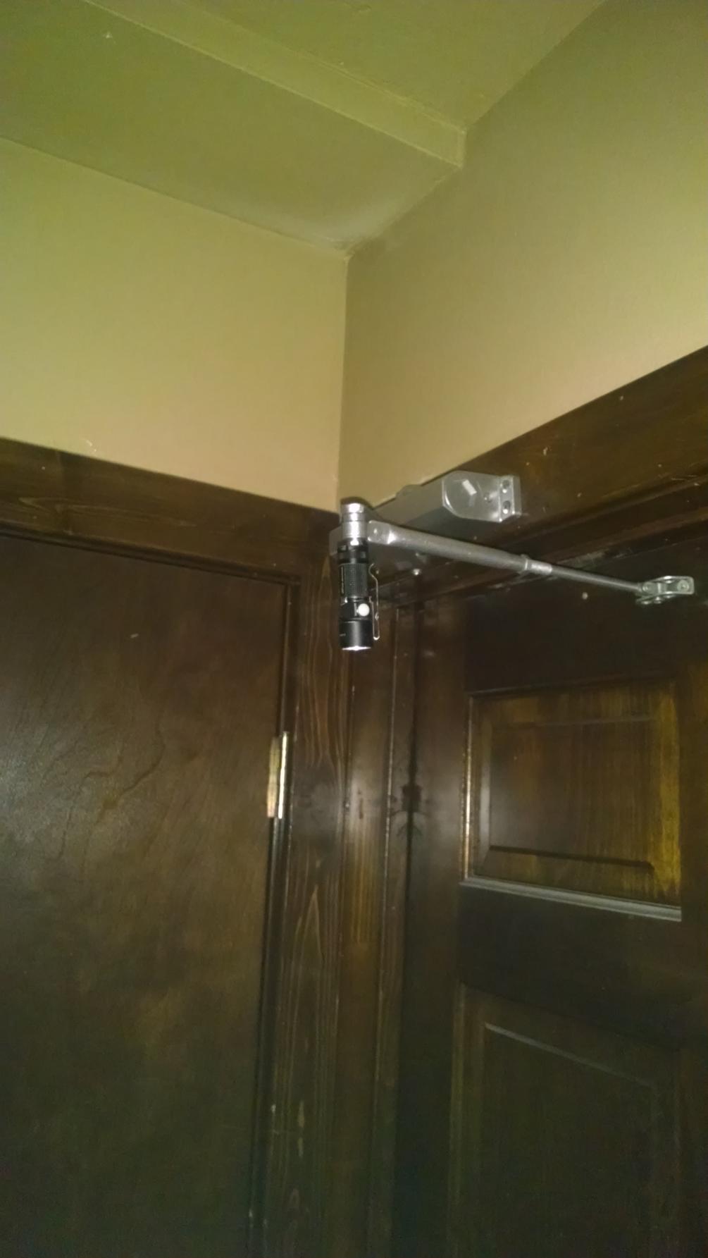 Then I came up with option three. I pulled out the Olight S10 baton out of my pocket. The main feature with this light is it has a magnet on the tail cap. So I turn it on and attach the magnet to the door closer arm. Enough light to pee by!