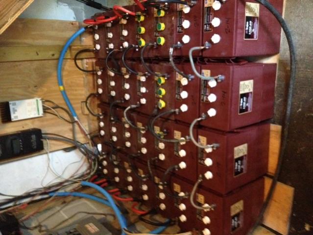 Ended up this go around with 28 L16's in the bank. Thankfully I've done a lot of little nit picky crap lately in that area including tearing out the old wooden parts of the battery box. This became a necessity as the original plan was for 20 batteries. Then it looked jury rigged when I went to 24. I nursed it along for a while and finally had the time to rip the whole thing out and start anew. Remember the "3 R's of the homestead" thread? Yep I was finally to the "ahh screw it, I'm gonna rip all this out!" phase. :) Using the opportunity of getting them all out of the area, I arranged them where the oldest are up front and the newest are in the back. Course this changed again recently with the addition of 8. Be sure to use a magic marker to date each batteries. A little dry erase board on the wall near the inverter allows me to write notes to remind myself when I last PM'ed the bank. Thereby cutting out the mental "I just did that" thought.