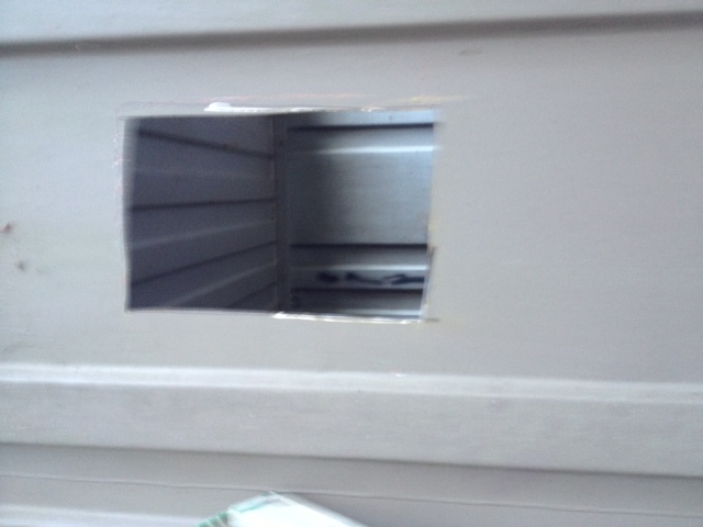 Fit whatever vent you choose in place and secure it. Be sure to caulk the hades out of it also, inside and out. Any security apparatus for the outside can be placed now or later- will not be shown in photos sorry.