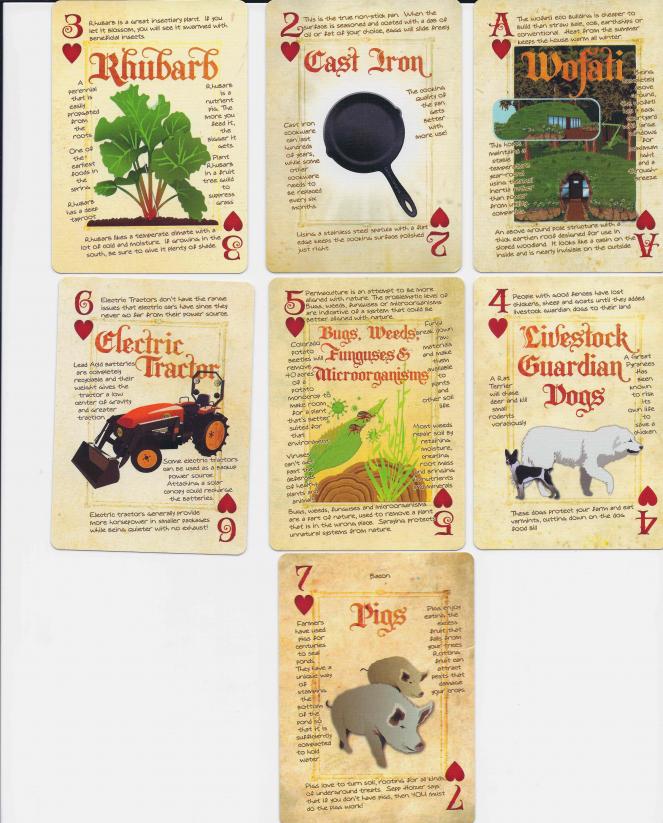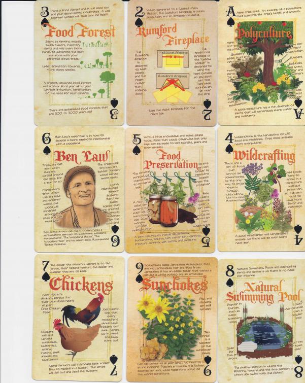 I bought a deck of Permaculture Playing cards mainly because I wanted to see the information on them. I scanned the cards @ 600 dpi so you can zoom in on them and read them better. The cards have info from Electric Tractors to Paddock Shift Grazing to Grey Water systems to comfrey.