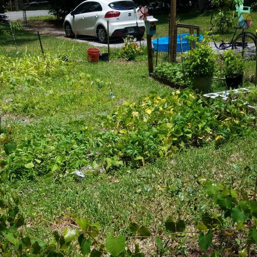 My tomato plants were put in 2 feet apart and they're over-running each other. The bush beans are ready to pick. All of my pepper plants are in flower with only one pepper actually growing right now. I have one eggplant that I planted.Everything looks extremely healthy this year. the garden is much smaller this year but this is the first time I actually have this much growing without having any root knot nematode issues.