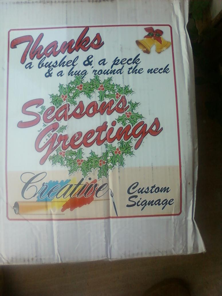 Basically it was a Christmas greeting box and it says "A kiss and a peck and a hug around the neck, Christmas greetings from your friends at ABC company"