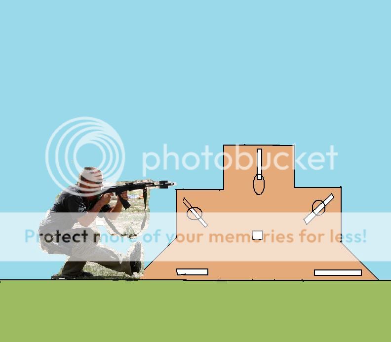 "The truck" as the wife calls it, is kinda sorta similar to what you drew Protus. I need to take a pic of it and post it. You can shoot modified prone off of both sides but the right side is an open hole in the bottom of it. So to utilize the right side of the cover you have to go modified prone or lay on your side (think it's called "Urban prone") type deal. You can kneel, stand up and left and right off of it.