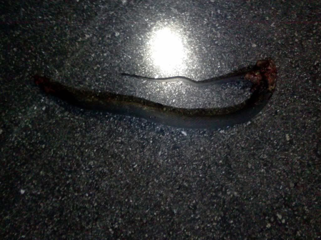 So i get home tonight, let the dog out and what do i see inches from my ankle....the head of a water moccasin poking out from under the building. I put the dog away, get my house mate, and my mossberg 500e youth model .410 pump. its got an 18 inch CB barrel from their pistol grip model on it. the house mate grabs a rake and chases the ****** out from under where he is hiding. i let one fly that blows his *** off but he makes it around the cornor of the building. i piie the corner at low ready, and there he is. he turns toward me, i line up the brass bead on his head and hit the trigger from 8 feet.