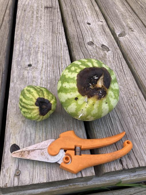 • That's a shame but it happens. Watermelons are succeptible to fungus (black spots on the shell) and blossom rot (solid black melon bottom; watering inconsistency issue). I have not run into that with melons, although I've seen it a few times in squash. It's not too late to start again, using "clean" soil and making sure to water consistently, especially when blossoms have formed and during initial fruiting.