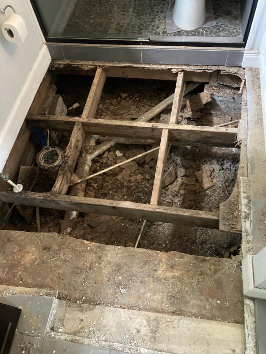 This was first day (see pics)...We removed the toilet and the home inspector was correct, the wax ring needed to be replaced :p ....BUT....we also found a lot of dry, but rotted wood (maybe previous termites?..hmm). Found a small, what appeared to be localized group of termites. He hired a pest control company needless to say. Yesterday, after treatment had been down, we were able to get back to work. We form fitted two 3/4" (really all HD had was 23/32") plywood boards one on top of the other after scabbing in new 2"x6" boards for support. Took us 7 hours as we were working in tight spot and all the cutting was done outside (and we made a run to HD for supplies), until the rain came down then we moved into garage. Next week we will put down the cement backed board fix the toilet flange issue, and then they will put down lifeproof flooring and reinstall the toilet. Wife helped the other wife paint three rooms while we guys worked on this project. So, today I will get to garden, likely weed a bit and relax some.