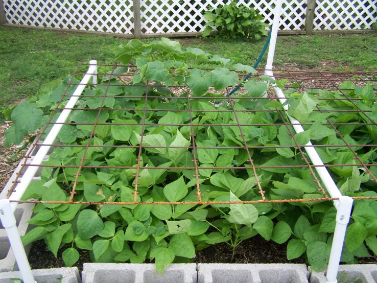 Green Beans ( I think Blue Lake); I thought they were bush beans, but I quickly found out that they are pole beans. I then place four tomato cages inside the bed to give the vines to grab on to, as I didn't have any kind of trellis. They are spreading all over the place now, but I have yet to see Green Bean number one.