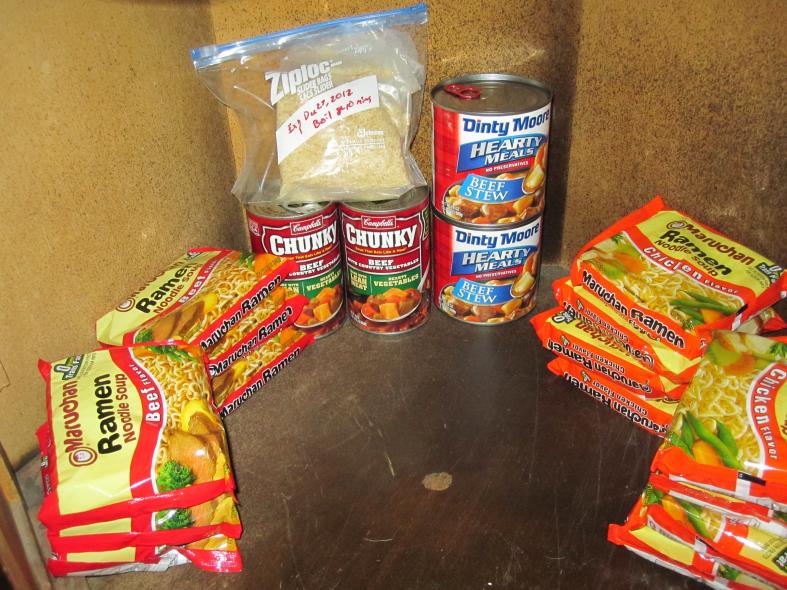 today when i went out to pick up dog food i made it a point to grab a handfull of extra chow that i can use to start my emergency food supply. my goal is to slowly but surely start building it up. right now i have enough food for a few days for my fiance and i(for around ten extra bucks on a random trip to the grocery store). i figure if i just grab a couple of things each time i hit the grocery store i can gradually build this to a months worth of food in a pretty short time and do it on the cheap. (dead horse, not rich). i have a little hexagon table that we just had some old junk cables and papers in, so i cleaned it out and am now using it as my emergency food supply depot. i dont want to store the stuff in my garage because it gets really hot in the summer and really (really really effin) cold in the winter. this little hex table is in my living room and no one ever really looks twice at it. anyways, takin some baby-steps here, feels good. pic attached. :cool: