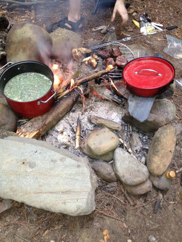 Long story short, find a decently flat rock (not wet or out of a creek) of sufficient size and clean the dirt off. Wash sparingly to get the crud off it. Build your bed of coals underneath and allow to heat up. Cook like a normal skillet. When finished, turn over cooking rock in fire and you are done cleaning. No muss, no fuss except for utensils. Funny thing is, you can go to these big time Five Star restaurants and pay $250 to have the same thing served up in front of you lol. If you are looking at shaving ounces and know there will be a variety of makeshift "cooking utensils" on your path, you can drop the grill and get to rockin. Even if all else fails and you cannot find a decent rock, skewers from green branches works perfectly fine to cook over an open flame.